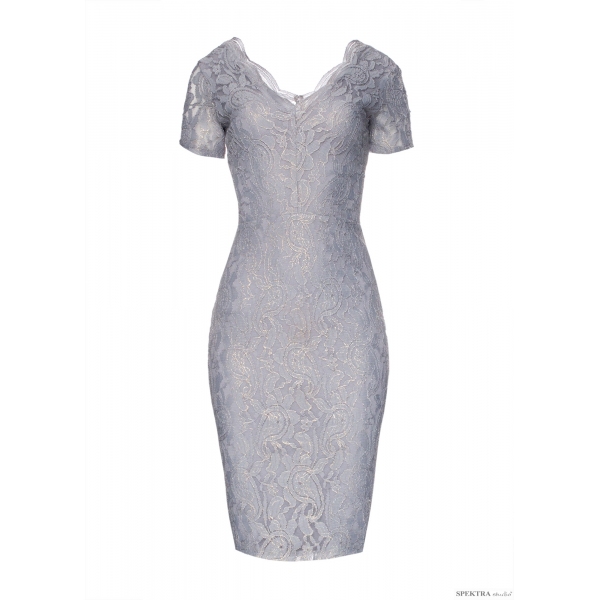 Sukienka z połyskujacej koronki z krótkim rękawem. Pięknie podkreśla talię. Dekold uwypuklony falami z koronki. Sukienka delikatnie połyskuje, co nadaje jej bardzo elegancki charakter. Idelana na przyjęcia weselne.