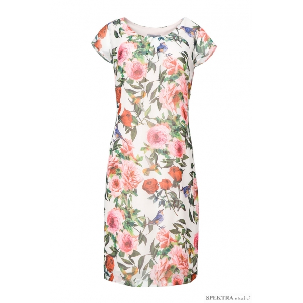 Śliczna szyfonowa sukienka na podszewce. Motylkowy, lekko przezroczysty rękawek. Tkanina w piękny wzory kwiatowe.