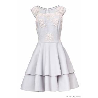 Sukienka z podwójną falbaną w stalowo niebieskim kolorze. Góra wykończona gipiurowymi kwiatami na tiulowej tkaninie. Bardzo elegancka i efektowna.